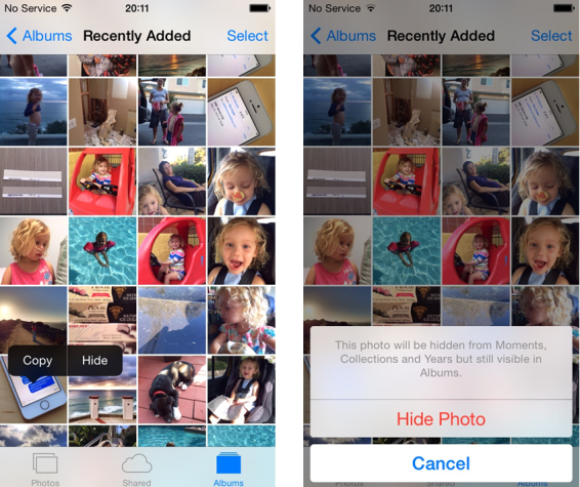 iOS8では写真を長押しタップすると従来の「コピー」に加えて「隠す(Hide)」メニューが表示されます。「隠す」を選ぶと、写真は「モーメント」「コレクション」「年別」からは見えなくなり、「アルバム」からのみ見られるようになります。